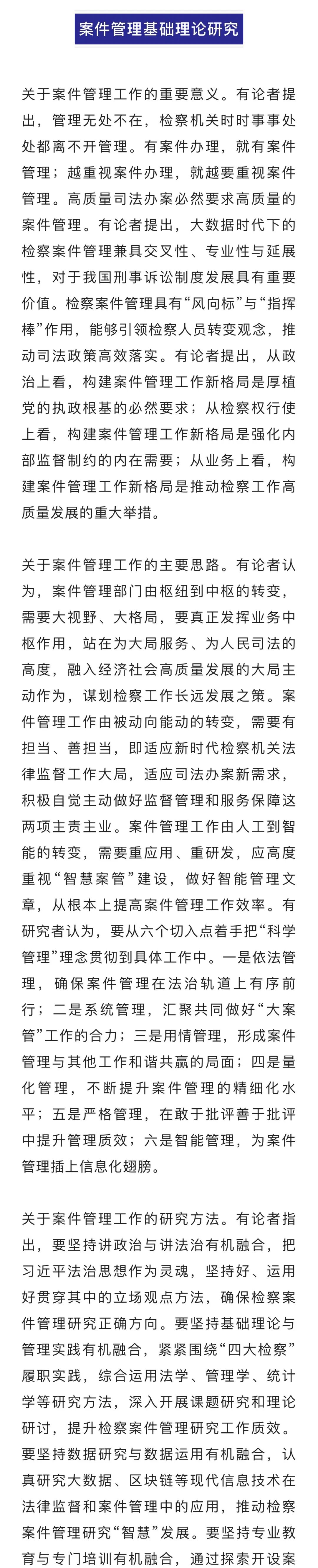2022年,检察机关案件管理理论与实务研究工作认真贯彻落实党的二十大精神,紧紧围绕最高365体育投注官网_神器365软件下载_365bet苹果版关于案件管理工作的决策部署和全国检察机关第二次案件管理工作会议精神,积极发挥中国法学会检察学研究会案件管理专业委员会的“主阵地”作用,在中国人民大学法学院设立检察案件管理研究基地,多次开展全国性的理论研究和理论征文等活动,推动各地聚焦案件管理重点、难点、焦点问题深入开展理论研究,形成一批论点观点鲜明、论据论证充分的理论文章,充分发挥理论引导实践、实践推动理论的作用。